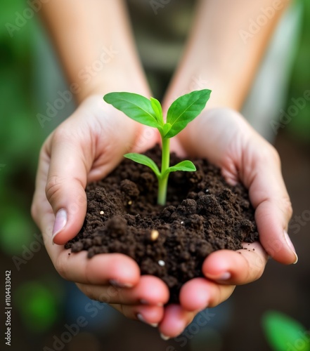 Girl tenderly holds small plant. Young sprout with soil in hands. Eco friendly concept in nature. Care for nature. Sustainable development, responsibility. Girl planting seedlings outdoors. New life