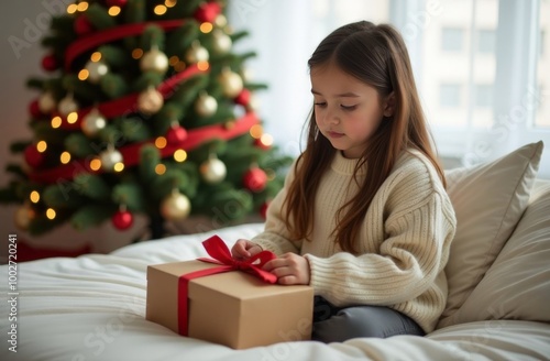 Girl unpacking New Year's gift sitting on sofa in bright apartment