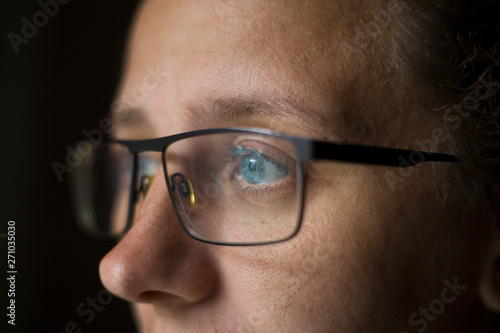 girl with glasses with beautiful eyes looks mysterious eyes, the concept of looking into the future of new technologies
