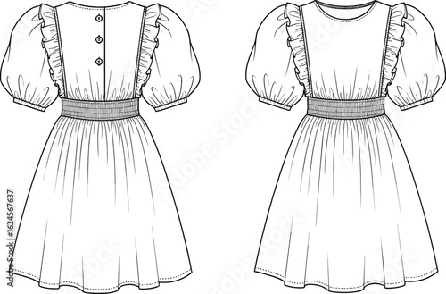 Girls dress fashion flat sketch with puff sleeves, ruffle details, and a smocked waistband, technical drawing front and back view.