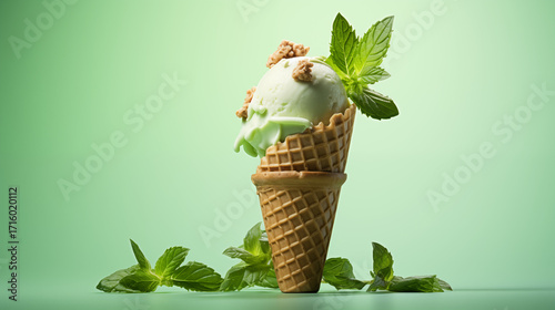 Glace verte à la menthe ou à la pistache sur un fond vert. Glace, sorbet, cône, pot. Rafraîchissante, estivale. Pour conception et création graphique.