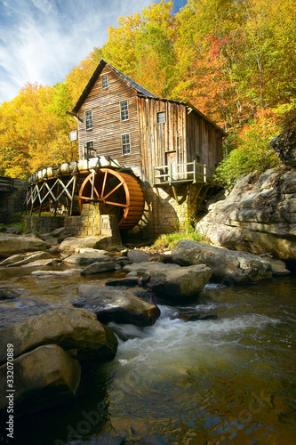 Glade Creek Grist Mil and autumn reflections and water fall in Babcock State Park, WV