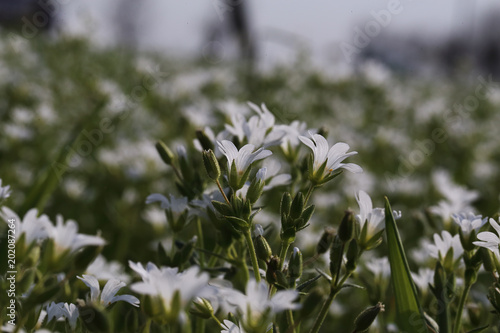 Glade of small white wildflowers at the time of spring flowering