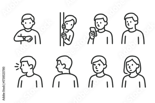 Glance Action Icons. Outline icon set of glance actions: glancing at watch, peeking behind curtain, checking phone, quick scan, glance over shoulder, subtle