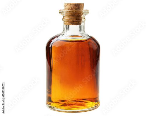 glass bottle filled with amber liquid, featuring cork stopper, isolated on transparency background. warm tones evoke sense of richness and quality