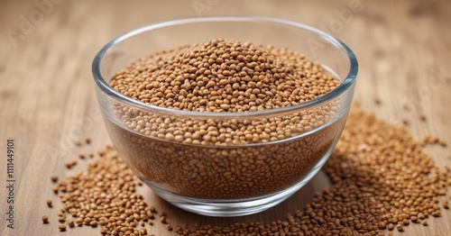 Glass bowl filled with tiny brown millet grains, kitchenware, glassware