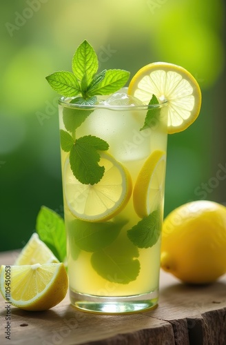 Glass cup with mojito cocktail on table in garden, natural background. Relaxation time. Harmony mood. Summer season. Cozy still life.