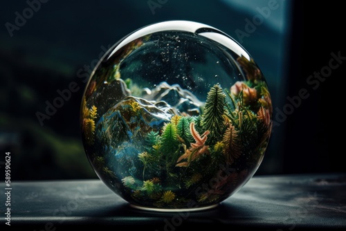 Glass globe with ferns in the water. Close up, Generative Ai