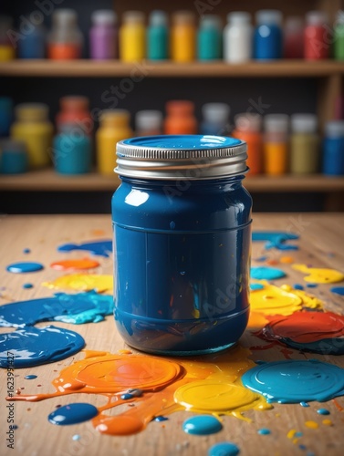 Glass jar filled with vibrant blue paint surrounded by colorful paint splatters on a wooden surface