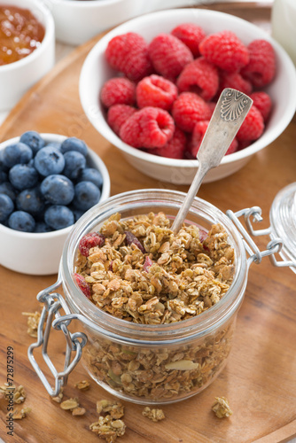 glass jar with homemade granola and berries, top view