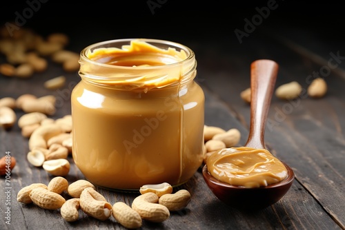 Glass jar with peanut butter on wooden background