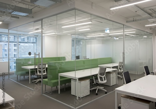 Glass office with green bench seating