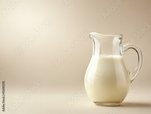 Glass Pitcher Filled with Fresh Raw Milk on a Neutral Background