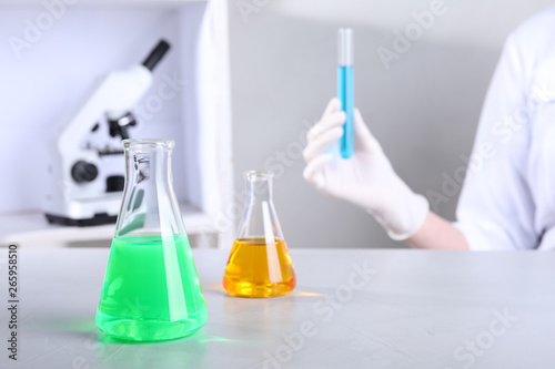 Glassware with samples on table and assistant in chemistry laboratory