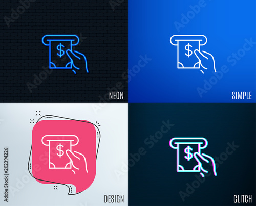 Glitch, Neon effect. Cash money line icon. Banking currency sign. Dollar or USD symbol. ATM service. Trendy flat geometric designs. Vector