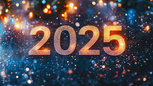 Glittering 2025 celebration with festive lights and sparkling background