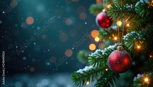 Glittering snowflakes fall on a Christmas tree background, ornaments, twinkling