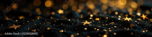 Glittery gold confetti scattered on a black velvet background, luxurious holiday decor, confetti decoration