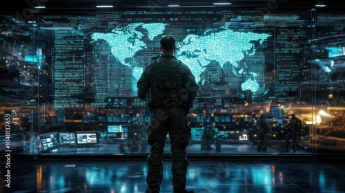 Global Military Operations Command Center – High-Tech Soldier Monitoring World Map and Cyber Intelligence Systems