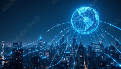 Global Network Connectivity: Futuristic Cityscape Illuminated by Digital World Map and Fiber Optic Lines