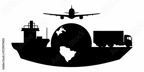 Global shipping solutions featuring a cargo ship, delivery truck, and airplane symbolizing worldwide transport and logistics for business needs