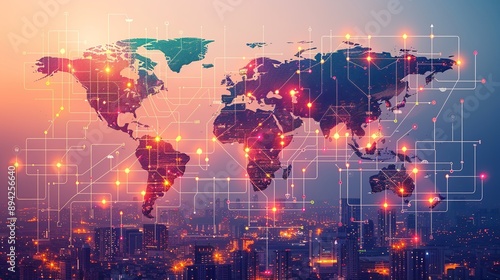 Global trade and commerce with abstract world map and shipping routes. Minimalist UI in a flat illustration style on a white background with bright Color scheme, dribble, flat Illustration ,