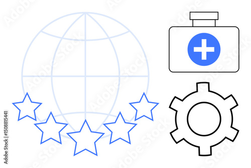 Globe behind five stars symbolizing global quality, medical kit with cross, and gear for efficiency. Ideal for healthcare, innovation, technology, global standards, logistics, management simple