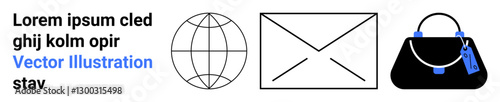 Globe outline, envelope with lines, and a black handbag with a blue tag. Ideal for communication, travel, fashion, branding, global networking digital design and promotional materials. Flat landing