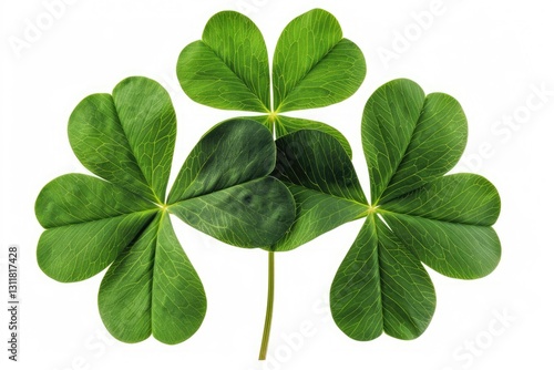 Glossy green three-leaf clover isolated on white background, a lucky Irish symbol perfect for St. Patrick’s Day decorations and designs.