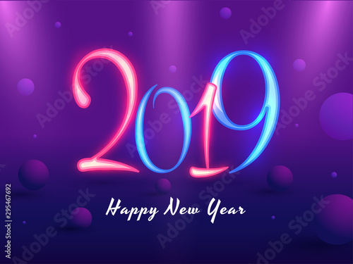 Glossy purple poster or template design with stylish neon lettering of 2019 for New Year celebration.