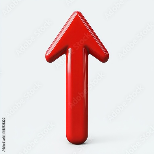 Glossy red arrow pointing straight upwards on a light neutral background conveying direction and progress