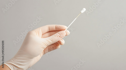 Gloved hand holds a cotton swab against a neutral background. This image evokes themes of medicine, healthcare, and lab testing, emphasizing sanitation and precision.