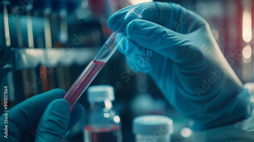 Gloved hands delicately handling a test tube filled with red liquid in a laboratory, emphasizing precision and scientific research.
