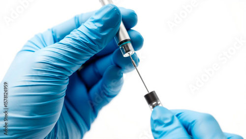 Gloved hands preparing a syringe for injection against a plain white background in a close up shot