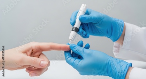 Gloved professional uses lancet device on patient's finger to test blood sugar