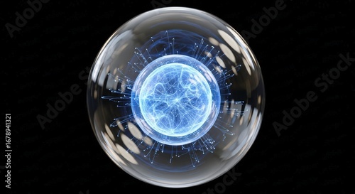 Glowing blue energy sphere with intricate patterns inside a transparent bubble.