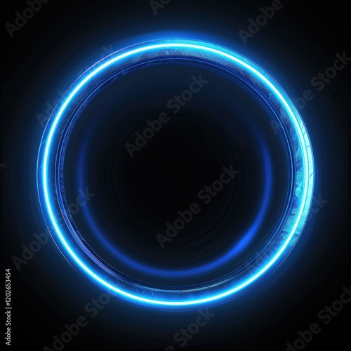 Glowing blue neon circle ring on transparent background; futuristic, abstract, technology.