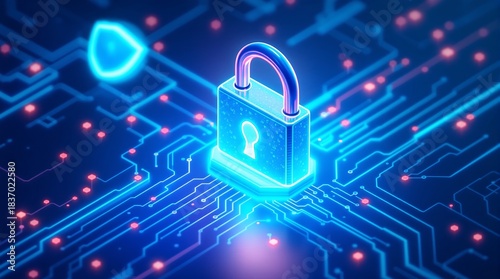 Glowing blue padlock on circuit board with neon lights