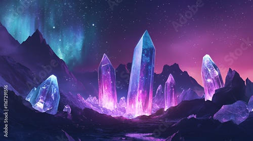 Glowing Crystal Mountains Under a Starry Aurora Sky