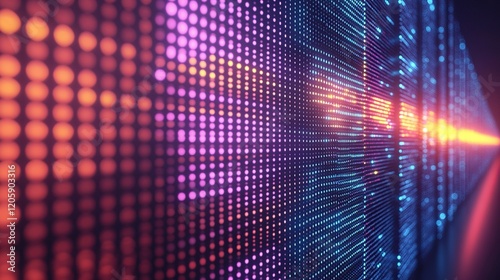 Glowing digital data stream on LED wall in cyberspace