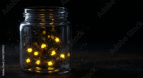 Glowing fireflies trapped inside a glass jar on a dark background.