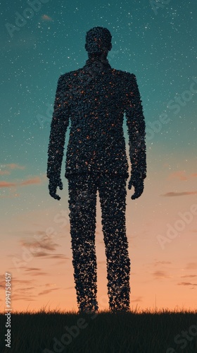 Glowing Giant Figure Reaching for Stars in Night Sky