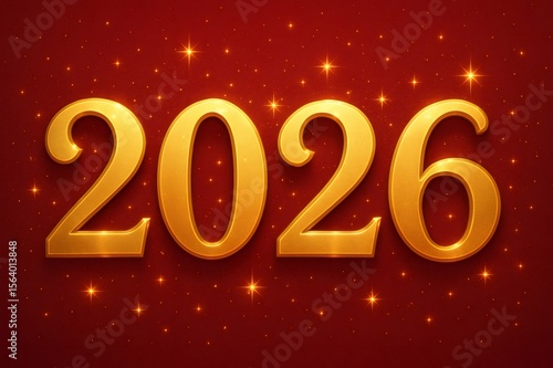 Glowing golden 2026 sign shining brightly against a vibrant red background, celebrating the excitement of the upcoming new year with festive stars