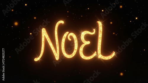 Glowing golden noel text on a dark background with sparkling stars, creating a warm and inviting atmosphere for christmas and the holiday season, spreading joy and cheer