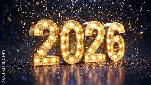 Glowing golden numbers 2026 with bright lights and confetti