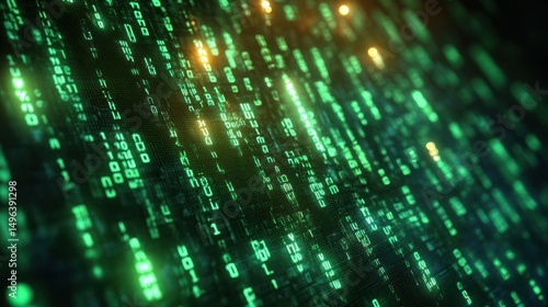 Glowing green digital code streams cascading down a dark screen representing data flow and technology with bright highlights