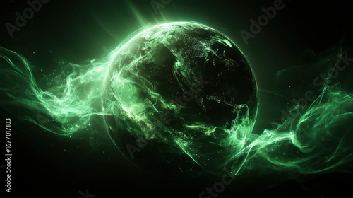 Glowing green planet surrounded by ethereal wisps of light creates captivating cosmic scene. vibrant colors and mystical atmosphere evoke sense of wonder and exploration