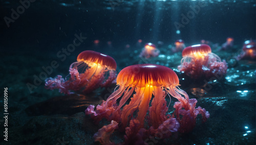 Glowing jellyfish swim deep in the deep blue sea. Medusa neon jellyfish fantasy concept.