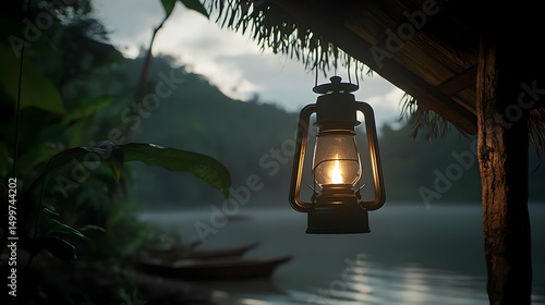 Glowing Lantern In Jungle Hut By River At Dusk