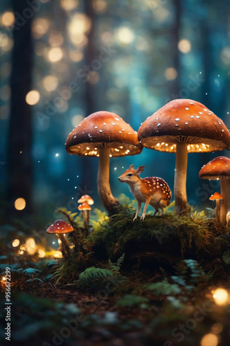 Glowing mushrooms in dark forest with blurred bokeh background , fairy tale forest with mushrooms